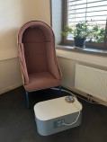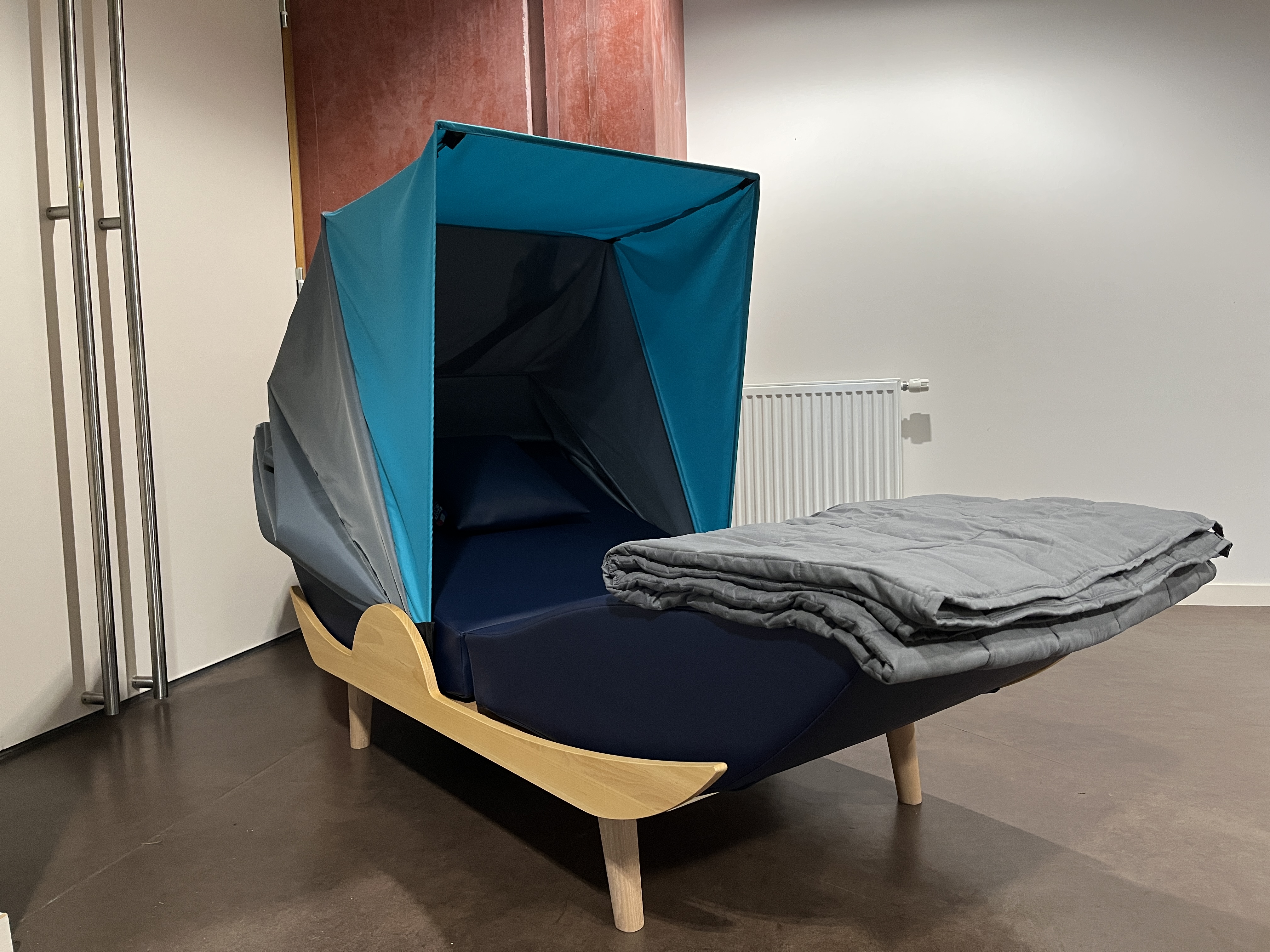 - Un espace “bulle de calme”, inspiré de la méthode Snoezelen, fournit un refuge en cas de surcharge sensorielle grâce à un “fauteuil à étreindre”, des couvertures et coussins lestés.
