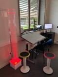 - Un système audiovisuel autour d’un écran interactif permet de projeter, annoter et enregistrer. Cela vise à favoriser la conception universelle des apprentissages (CUA), en facilitant la diffusion des cours. L’installation étant similaire à celle des salles de formation pilotes du projet, cela nous permet de proposer des démonstrations, sensibilisations et formations autour de cet outil.