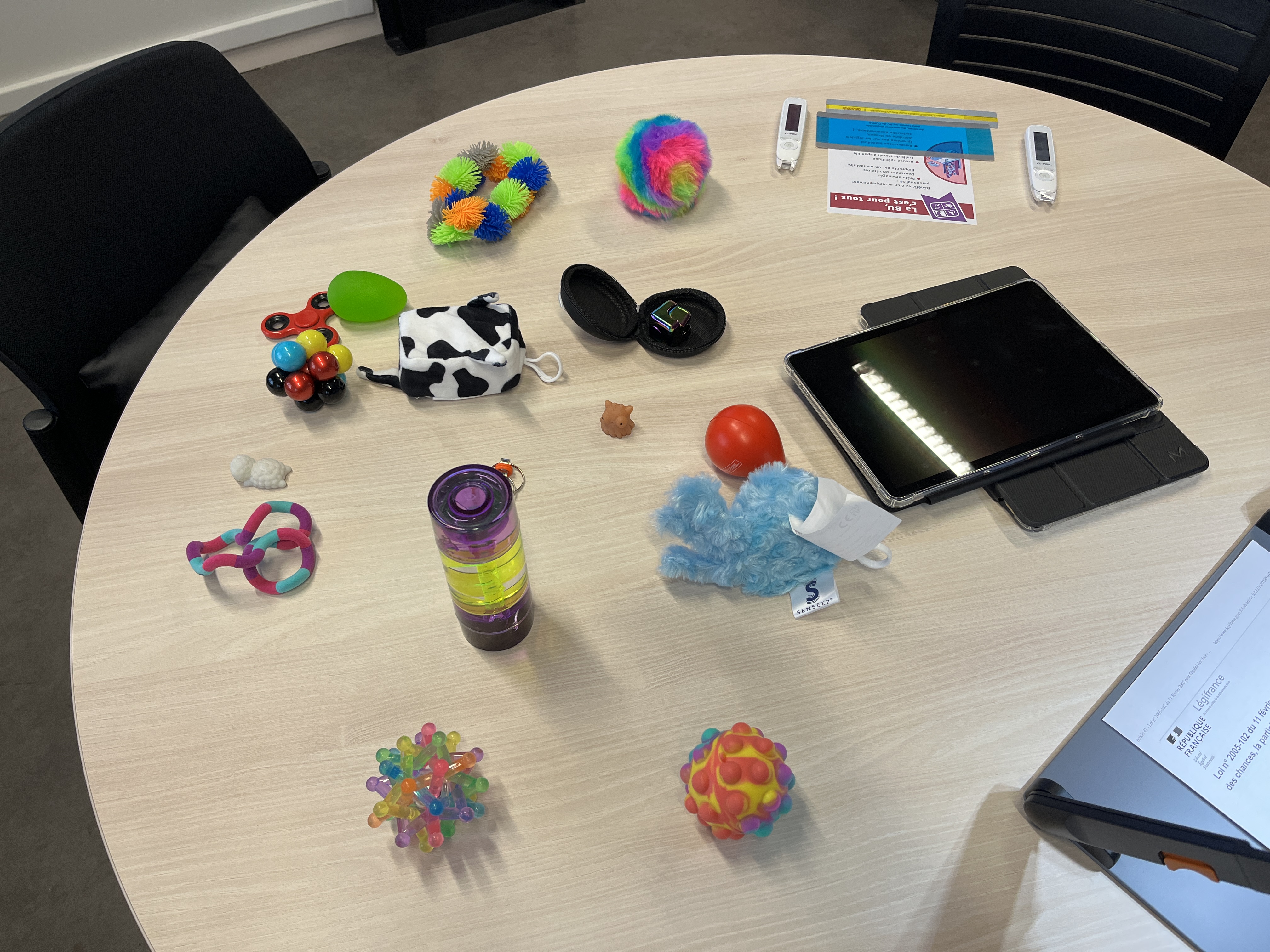 - Des outils comme des fidgets sont disponibles pour soutenir la concentration des personnes neuroatypiques ou répondre à des besoins particuliers.