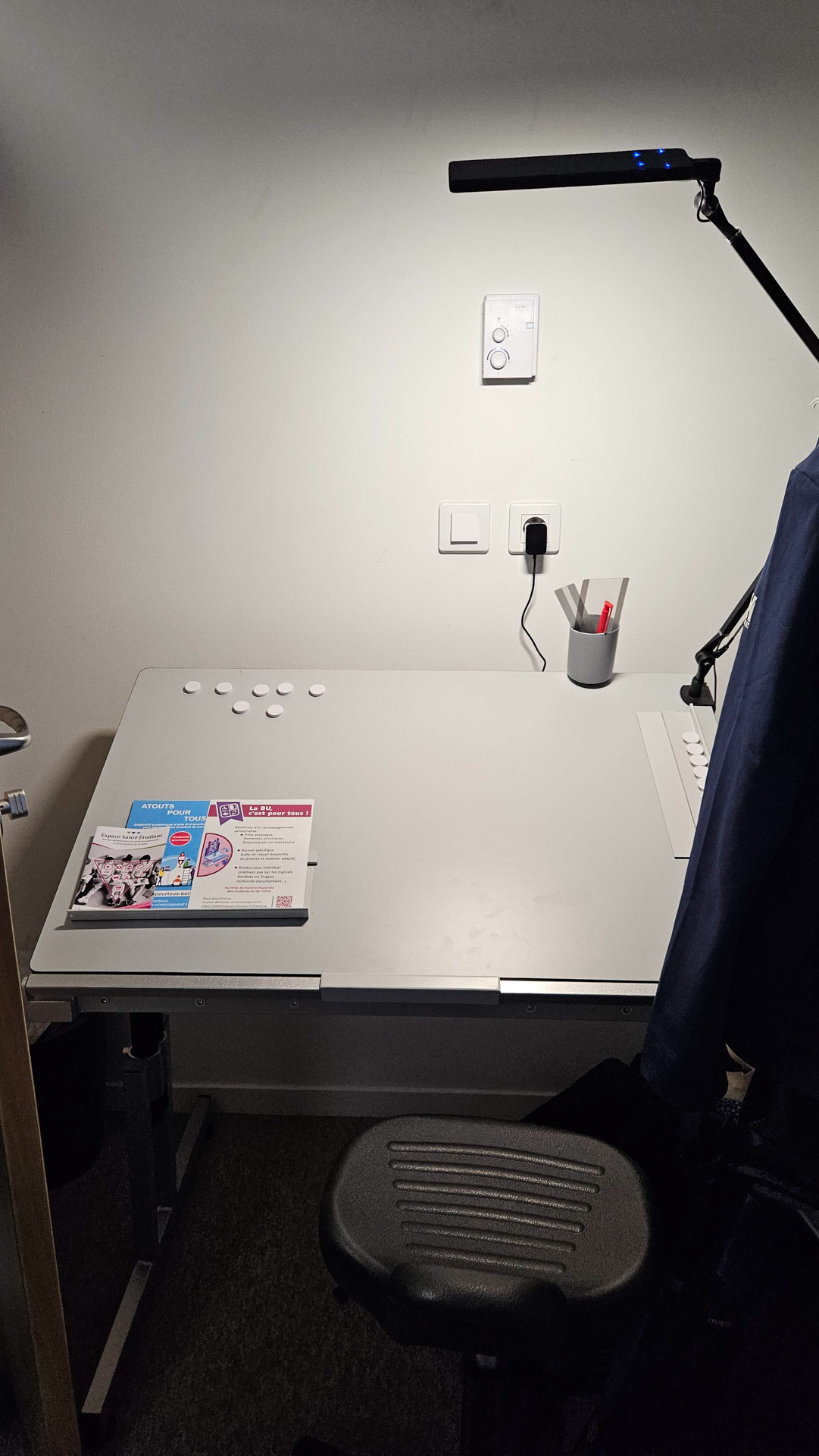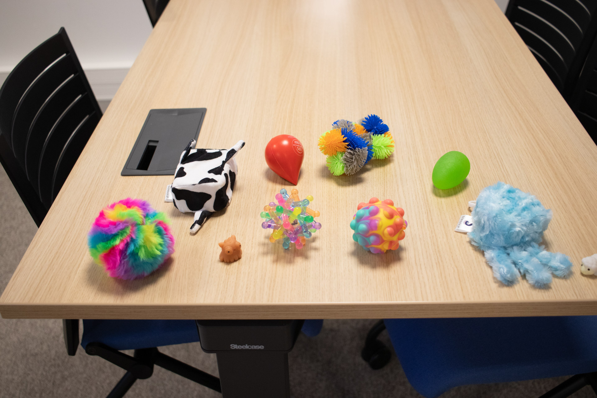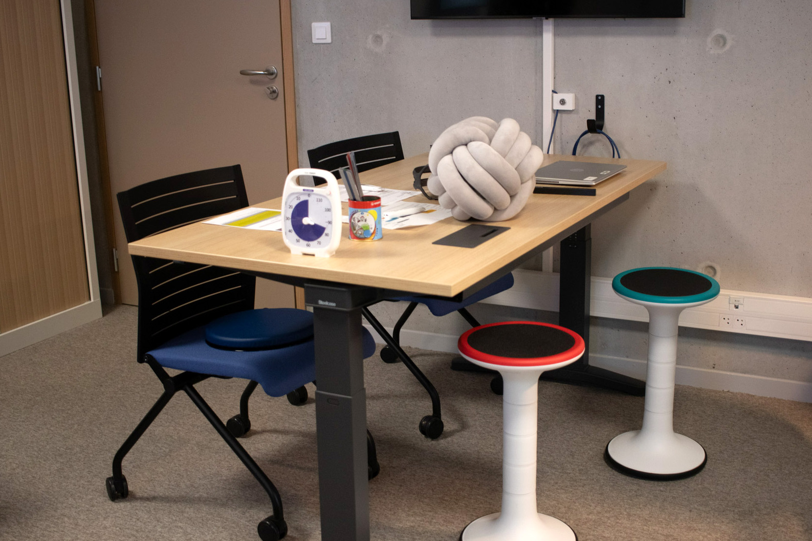 - fidgets (petits objets à manipuler), timer, casque antibruit, couverture lestée... pour soutenir la concentration des personnes neuroatypiques ou répondre à des besoins particuliers.