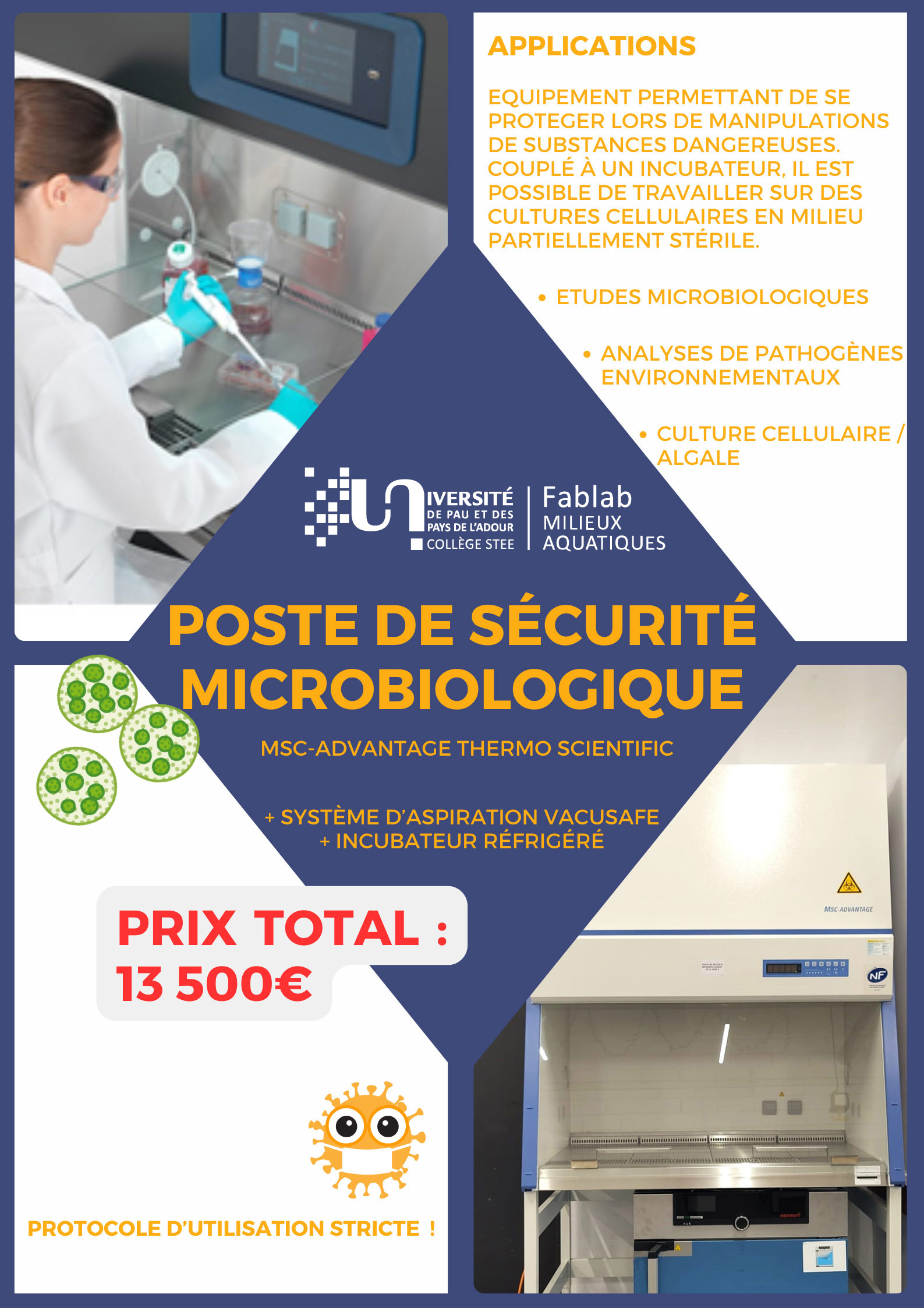 Avant toute utilisation du poste de sécurité microbiologique (PSM), l’utilisateur doit avoir suivi une formation spécialisée réalisée par la fabmanager ou par un tuteur autorisé. La demande peut être faite auprès de la fabmanager.