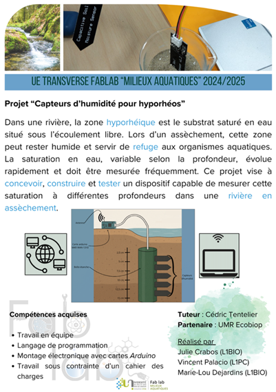 Dans une rivière, la zone hyporhéique est le substrat saturé en eau situé sous l’écoulement libre. Lors d’un assèchement, cette zone peut rester humide et servir de refuge aux organismes aquatiques. La saturation en eau, variable selon la profondeur, évolue rapidement et doit être mesurée fréquemment. Ce projet vise à concevoir, construire et tester un dispositif capable de mesurer cette saturation à différentes profondeurs dans une rivière en assèchement.
