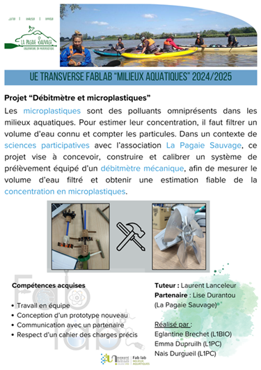 Les microplastiques sont des polluants omniprésents dans les milieux aquatiques. Pour estimer leur concentration, il faut filtrer un volume d’eau connu et compter les particules. Dans un contexte de sciences participatives avec l’association La Pagaie Sauvage, ce projet vise à concevoir, construire et calibrer un système de prélèvement équipé d’un débitmètre mécanique, afin de mesurer le volume d’eau filtré et obtenir une estimation fiable de la concentration en microplastiques