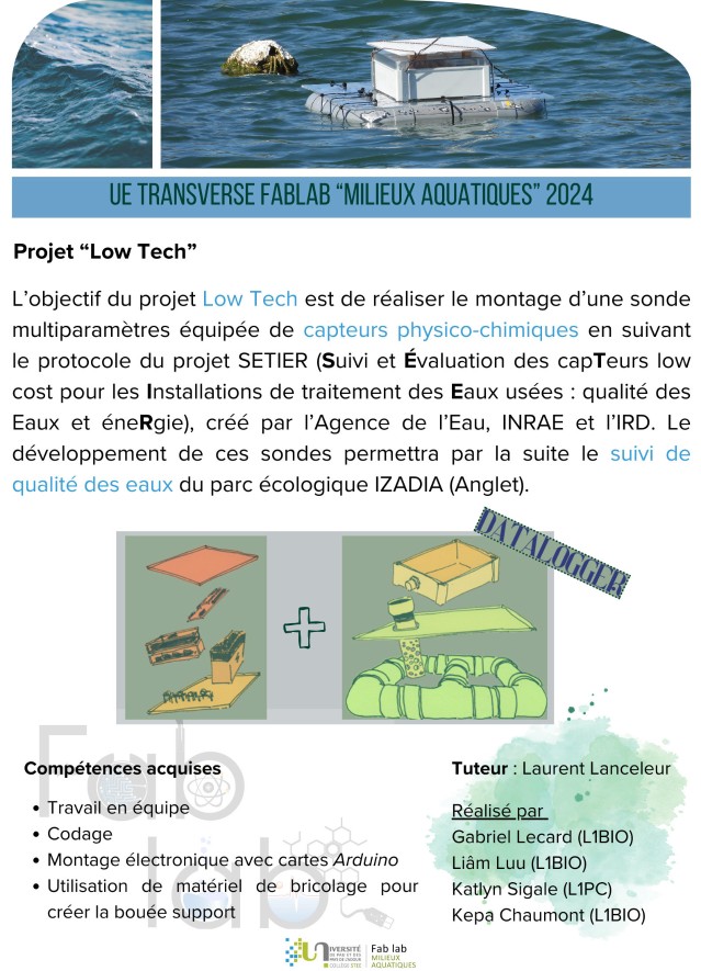 L’objectif du projet Low Tech était de réaliser le montage d’une sonde multiparamètres équipée de capteurs physico-chimiques en suivant le protocole du projet SETIER (Suivi et Évaluation des capTeurs low cost pour les Installations de traitement des Eaux usées : qualité des Eaux et éneRgie) créé par l’Agence de l’Eau, INRAE et l’Institut de Recherche pour le Développement. Le développement de ces sondes permettra par la suite le suivi de qualité des eaux du parc écologique Izadia (Anglet).